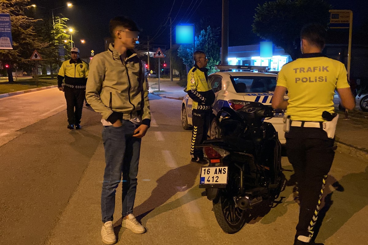 İnegöl Emniyet Müdürlüğü Trafik ekipleri Turgutalp Mahallesi Mimar Sinan Bulvarı üzerinde motosiklet sürücülerine yönelik uygulama yaptı. Uygulamada 16 ANS 412 plakalı motosiklet ekiplerce durduruldu. Yapılan incelemede motosikletin sürücüsü Berat Ö.'nün (16) ehliyetsiz olduğu tespit edildi. Cezai işlem uygulandığı sırada motosiklet sürücüsü Berat Ö., polis ekiplerine ceza yazmamaları konusunda ısrarda bulundu. Ehliyet için başvuru yaptığını söyleyen sürücü, "Benim amcam da polis, arayayım 2 dakika konuşun. Nolur ceza yazmayın" diyerek ısrar etse de, ehliyetsiz araç kullanmaktan 3 bin 674 TL cezai işlem uygulandı.