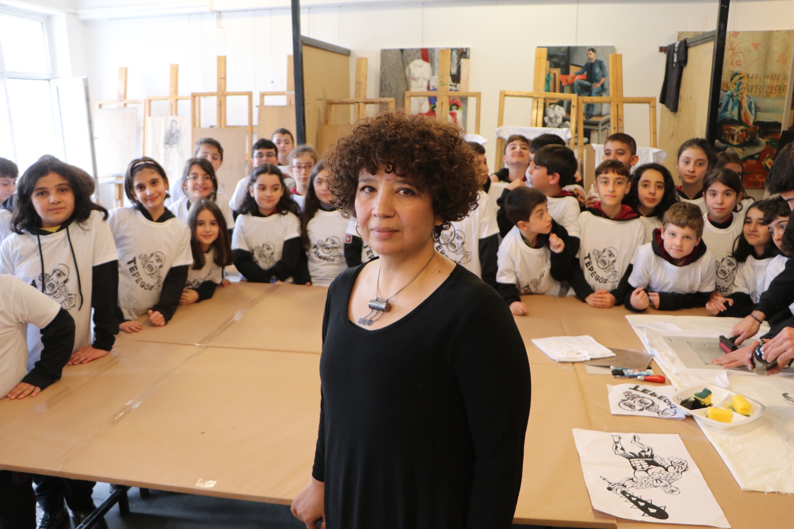 Resim atölyesi öğrencileri, hikayesini anlattıkları Tepegöz'ün resmini tişörtlere bastı. Ortaokul öğrencilerinin büyük bir dikkatle izledikleri çalışmada öğrenciler, baskı resim tekniği hakkında da bilgi verdi. Çalışma sonunda Tepegöz resmi bastırılan tişörtler, ortaokul öğrencilerine hediye edildi.