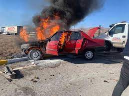 Kazada hafif yaralanan sürücü aracının yandığını yaşlı gözler