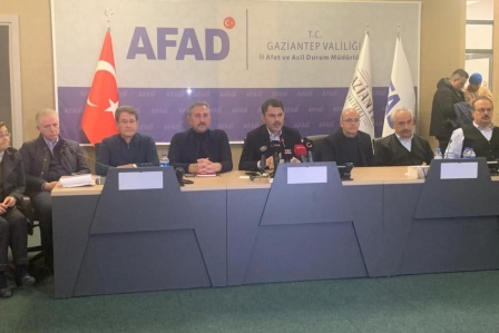 Erzurumbulten-Kahramanmaraş merkezli depremlerde, çok sayıda binanın yıkıldığı ya da hasar gördüğü Gaziantep'e gelen Çevre, Şehircilik ve İklim Değişikliği Bakanı Murat Kurum toplantı düzenledi. Gaziantep AFAD Koordinasyon Merkezi'ndeki toplantıya Bakan Kurum'un yanı sıra, eski bakanlar Mehmet Şimşek ve Abdülhamit Gül, Gaziantep Valisi Davut Gül, İl Emniyet Müdürü Mustafa Emre Başbuğ, İl Jandarma Komutanı Tuğgeneral Hidayet Arıkan, askeri erkan, AFAD yetkilileri ve kurum müdürleri katıldı. Bakan Kurum 10 ilde 307 bin 763 binanın incelendiğini söyleyerek, Cumhuriyet tarihinin en büyük afet konutu seferberliğini başlatarak, 1 yıl içerisinde tamamlayacaklarını ifade etti.