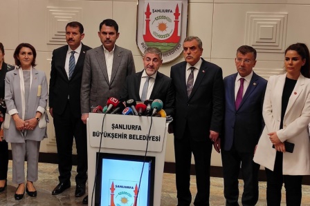 Şanlıurfa Büyükşehir Belediyesini ziyaret eden Hazine ve Maliye Bakanı Nureddin Nebati ile Çevre, Şehircilik ve İklim Değişikliği Bakanı Murat Kurum, Belediye Başkanı Zeynel Abidin Beyazgül ile görüştükten sonra çıkışta basın mensuplarının karşısına geçti.