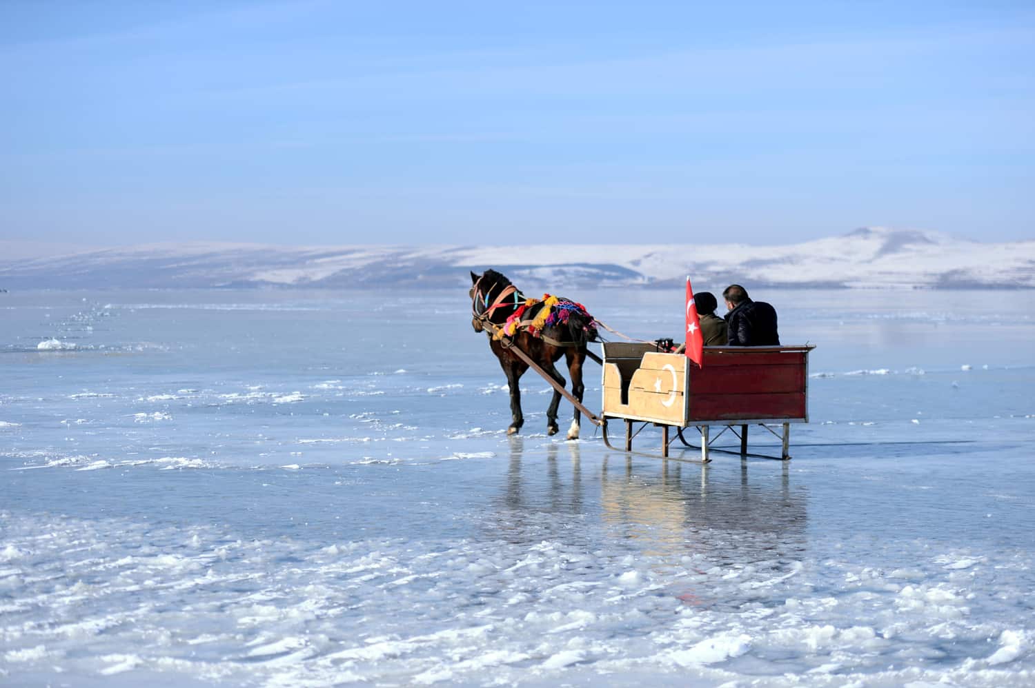 Kar yağışının ardından, hava sıcaklığının sıfırın altında 10 dereceye kadar düşmesi nedeniyle Çıldır Gölü’nün yüzeyi buz tutmaya başladı. Yüzeyi yaklaşık 10 santim buz tutan Çıldır Gölü’nün simgesi haline gelen atlı kızaklar da buzun üzerine çıkmaya başladı. Yerli ve yabancı turistleri buz üzerinde gezdiren atlı kızaklar keyifli anlar yaşatıyor.