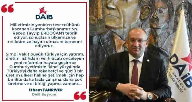 Ülke olarak bir seçim dönemini daha demokrasi şöleni havasında tamamlandığını dile getiren DAİB Yönetim Kurulu Başkanı Ethem Tanrıver, ‘Milletimizin teveccühü ile yeniden seçilen Cumhurbaşkanımız Sayın Recep Tayyip Erdoğan'ı tebrik ediyor, seçim sonuçlarının ülkemize ve milletimize hayırlı olmasını diliyoruz. Şimdi Vakit, büyük Türkiye için yatırım, üretim, istihdam ve ihracatı önceleyen yeni reformlar hayata geçirme; Cumhuriyetimizin ikinci yüzyılında başta bölgemiz olmak üzere, Türkiye'yi daha rekabetçi ve güçlü bir üretim ülkesi haline getirmek için hep birlikte daha fazla çalışma, daha çok üretme ve elbirliği yapma vakti' dedi.