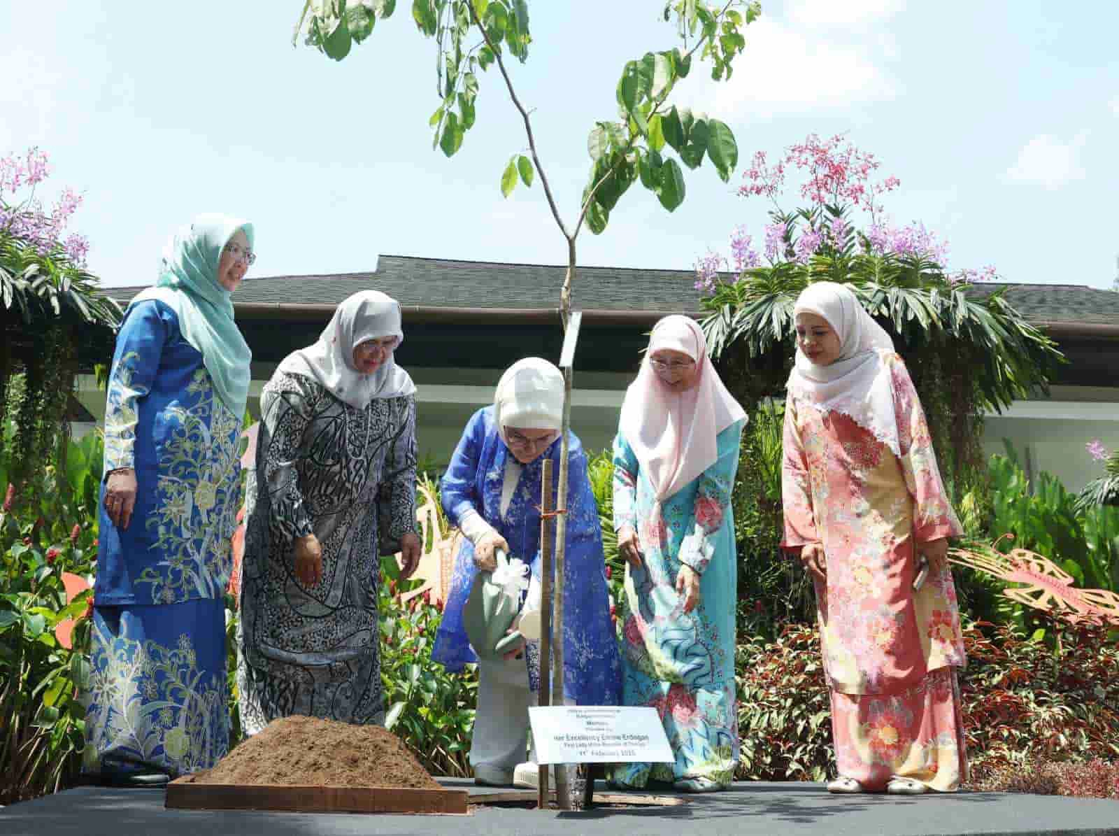 Perdana Botanik Bahçesi anı defterini imzalayan Emine Erdoğan ve Dr. Wan Azizah İsmail, ziyaret anısına bahçeye, gücü ve dayanıklılığı temsil etmesi ve derin kültürel öneme sahip olmasından dolayı "Malezya’nın Ulusal Ağacı" olarak nitelendirilen "merbau" ağacını dikti.