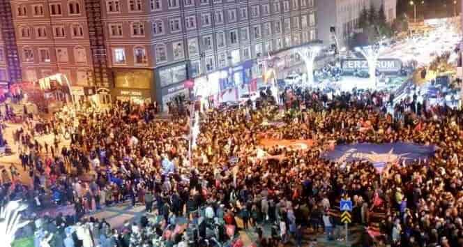 Cumhuriyet Caddesi'nde toplanan vatandaşlar, trafiğe kapatılan caddede coşkulu anlar yaşadı. Meşaleler ve havai fişekler eşliğinde kutlama yapan vatandaşlar sık sık tekbir getirdi, Cumhurbaşkanı Recep Tayyip Erdoğan'a yönelik sevgilerini dile getirerek sloganlar attı. 2 bin 241 sandıkta 510 bin 238 seçmenin oy kullandığı Erzurum'da; 423 bin 959 oy kullanılırken bunların 416 bin 677 geçerli sayıldı. Erzurum'da seçime yüzde 83 oranında bir katılım olduğu gözlendi.