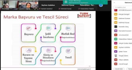 Moderatörlüğünü, ETSO Türk Patent ve Marka Kurumu Bilgi ve Doküman Birimi Temsilcisi Edanur İspirli'nin yaptığı online eğitime; Sınai Mülkiyet Uzmanları Hüseyin Demir ve Elif Başpınar, ETSO Genel Sekreteri Kürşat Karagöl, kamu kurum ve kuruluşların temsilcileri ile firma yetkilileri katılım sağladı. Toplantıda, Marka ve Coğrafi İşaretler Mevzuatı, başvuru süreçleri ve tescil sonrası işlemler ile ilgili Sınai Mülkiyet Uzmanları tarafından detaylı bir şekilde bilgilendirme yapıldı.