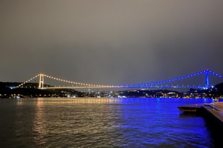 Fatih Sultan Mehmet Köprüsü, 31. bağımsızlık yılını kutlayan Ukrayna'nın bayrak renkleri olan mavi ve sarı renklerle ışıklandırıldı.
