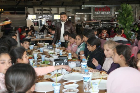 İş insanı Ferit Kaya, lokantaya kalabalık bir şekilde gelen öğrencilerin biran evvel yemek yemeleri için onlara bir garson gibi yemek servisi de yaptı.