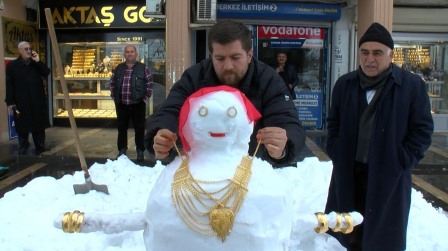 Muş'ta etkili olan kar yağışı, günlük yaşamı olumsuz etkilerken, eğlence aracı da oluyor. Belediye ekipleri, kalınlığı yaklaşık 50 santimetreye ulaşan karları temizlemek için uğraşırken, belediye ek hizmet binası altında iş yerleri bulunan kuyumcu esnafı da kardan adam yerine 'kardan gelin' yaptı. 'Kardan gelin', bölgede ilgi odağı oldu. Kuyumcu Ekrem Akdaş, ‘kardan Gelin'i altın kolye ve bilezikler ile süsledi. Değeri yaklaşık 400 bin lira olan 350 gram altın takılan 'kardan gelin'i görenler ve esnaf fotoğraf çektirdi.