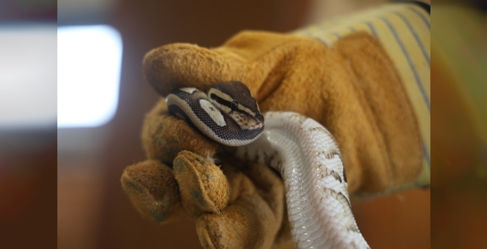 Erzurumbulten-Konya’da polis ekipleri tarafından gerçekleştirilen asayiş kontrolü sırasında bir şahsın cebinden çıkan yavru piton yılanı, Doğa Koruma ve Milli Parklar ekiplerince teslim edildiği Karatay Belediyesi Hayvanat Bahçesinde özel ortamında bakım ve beslemeye alındı.