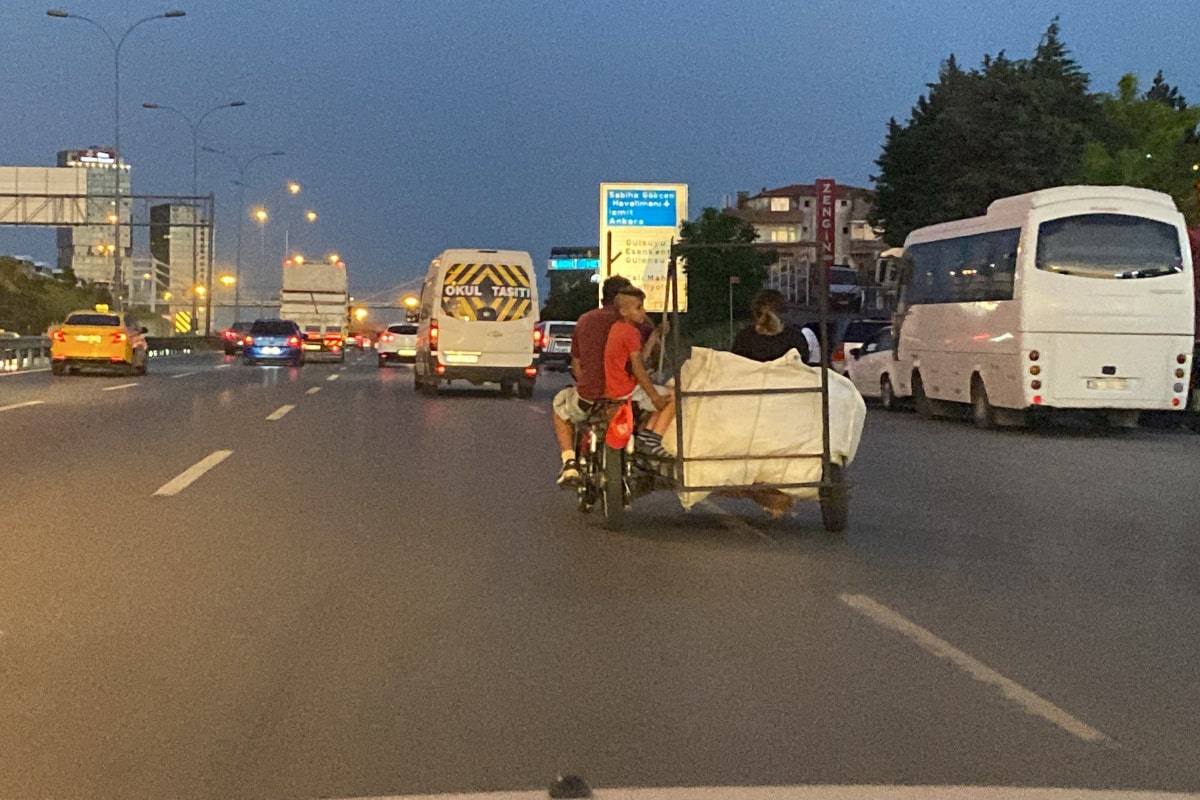 Maltepe D-100 karayolunda plakasız bir motosiklet üzerinde ilerleyen biri çocuk 3 kişi yürekleri ağza getirdi. Motosikletin yan kısmına bağlanmış alanda karton torbası üzerine oturan kadın ve motosikletin arka koltuğuna yan şekilde oturan küçük çocuk D-100 karayolunda hem kendi canlarını hem de trafiği tehlikeye attı. Küçük çocuğun motosiklet üzerinde korumasız ve tehlikeli şekilde oturması sürücüleri korkuttu. Vatandaş kamerasına