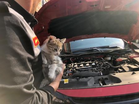 Araç sürücüsüne ilk etapta telefonla ulaşamayan itfaiye ekipleri kriko yardımıyla otomobilin biraz yükseğe kalkmasını sağladı. Kedinin motor kısmına sığındığı fark edilince araç sürücüsünün gelerek kaputu açması beklendi. Kısa süre sonra araç sürücüsü gelerek kaputu açtı. İtfaiye ekibi motor kısmına giren yavru kediyi herhangi bir zarar vermeden çıkarmayı başardı.