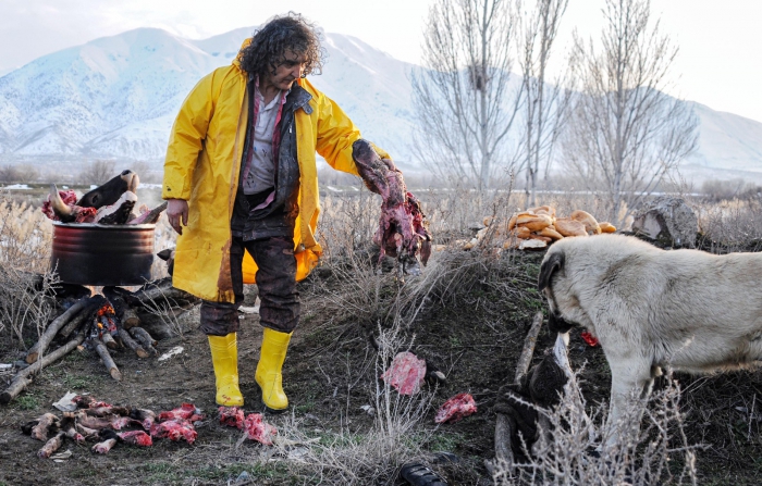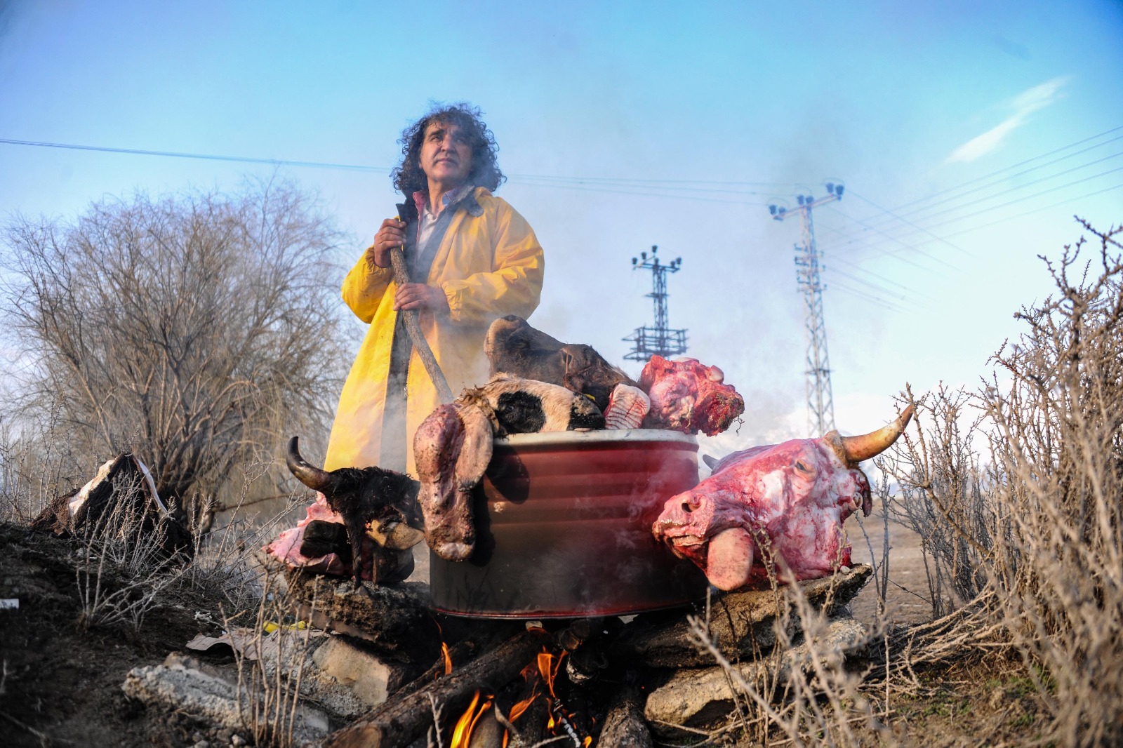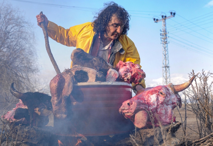 Sanatçı, şiddeti çarpıcı ve güçlü bir biçimde anlatan parçalanmış hayvan organlarını kazanda kaynattıktan sonra devirerek bu parçaları etrafa saçtı. Saçılan bu organlardan kendi paylarını almak için kazanın etrafında gezinen köpekler, hem geçmişte hem de günümüzde devam eden savaşlarda böylesi bir zulmü gerçekleştiren ve bunu kendi çıkarları için kullanan insanlara gönderme yaptığını belirten Kavukcu, "Bu durum günümüzde yaşanan olayları temsilen kurgulandığından; birçok düşünürün gözünden baktığımızda metaforik anlamıyla vahşi yaşam biçimlerinde de egemenliklerin, uzlaşmaların, savaşların, yani politik öğelerin olduğunu düşünebiliriz" diye konuştu.