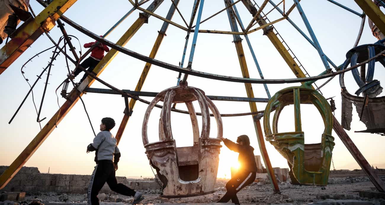 Suriye’nin Yermuk Mülteci Kampı’nda binaların yanı sıra oyun alanları da yıllarca süren çatışmaların izlerini taşıyor. Muhaliflerin yönetime gelmesiyle normalleşme sürecine giren ülkede çocuklar, Esad rejiminde bombalanarak harabeye dönen lunaparkta oyun oynuyor.