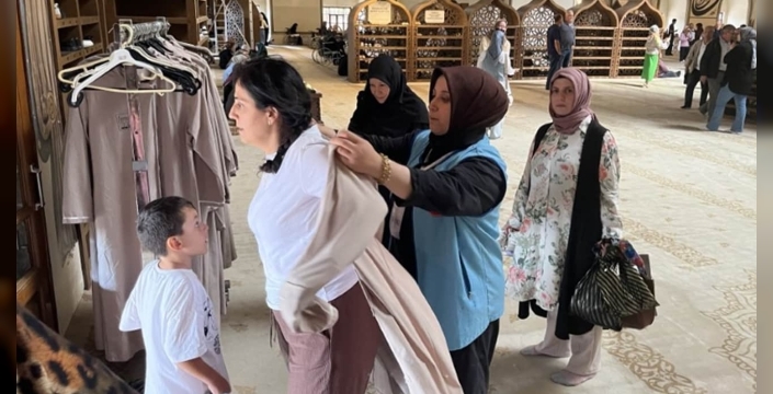 Girişte yer alan uyarı levhaları ve mavi yelekli görevliler, ziyaretçilere nasıl giyinmeleri gerektiğini nazikçe anlatıyor. Uygun kıyafeti olmayanlara ise Diyanet Vakfı tarafından anında giysi temin ediliyor.
