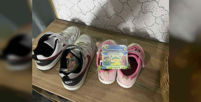 Çorum’un Laçin ilçesinde camiye giden çocuklar, teravih namazı çıkışında ayakkabılarının içine bırakılan sürpriz hediyeleri görünce mutluluk yaşadı.