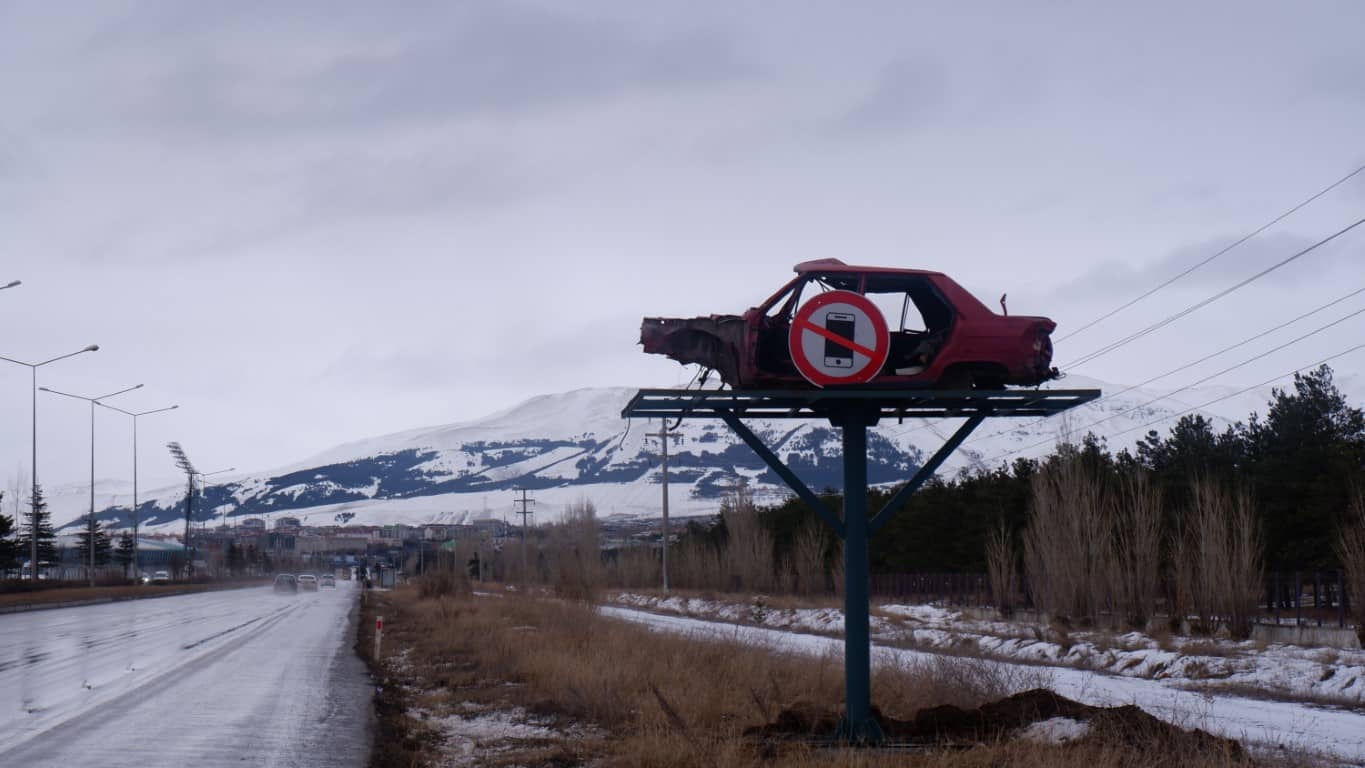 Erzurum’da trafik kazalarını önlemek amacıyla, Emniyet Müdürlüğünce ilginç bir çalışmaya imza atıldı. Kaza sonucu hasar almış hurda araçlar yol kenarına yerleştirilerek farkındalık oluşturuldu. Hurda araçların üzerine hız kilometre sınırı ve cep telefonu ile konuşulmaması gibi uyarı işaretleri yerleştirildi.