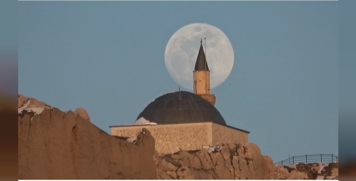 Van’da gece Van Kalesi üzerinde yükselen dolunay, izleyenlere adeta görsel bir şölen sundu.