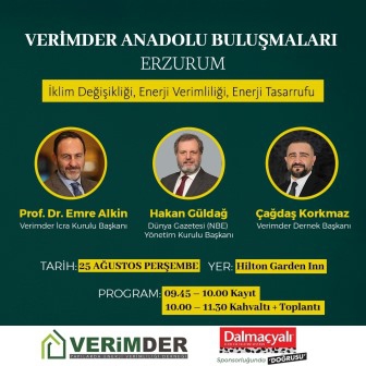 VERİMDER İcra Kurulu Başkanı Prof. Dr. Emre Alkın, Dünya Gazetesi Yönetim Kurulu Başkanı Hakan Güldağ ve VERİMDER Dernek Başkanı Çağdaş Korkmaz'ın konuşması olarak katılacağı toplantıda, enerji kayıpları, iklim değişikliğinin yanı sıra tüketicilerin bütçesini de olumsuz şekilde etkileyen konular ele alınacak. Geleceğimizin belirleyicisi bu önemli konuda değer yaratmak ve farkındalık oluşturmak amacıyla, Yapılarda Enerji Verimliliği Derneği (VERİMDER) olarak çalışmaların hızla devam ettiğini söyleyen VERİMDER İcra Kurulu Başkanı Prof. Dr. Emre Alkın, "Bu doğrultuda iklim değişikliği, enerji verimliliği ve enerji tasarrufu konularını ele alacağımız Anadolu Buluşmaları'nı gerçekleştiriyoruz. Bugüne kadar toplam 22 ilde kanaat önderleri, yerel yönetimler ve tüketicilerin katılımıyla enerji verimliliği ve tasarrufu çerçevesinde çok önemli gelişmeler kaydedildi. Bu çerçevede son durağımız Türkiye'nin en büyük ve enerji verimliliğine en çok ihtiyaç duyan Erzurum olacak" diye konuştu.