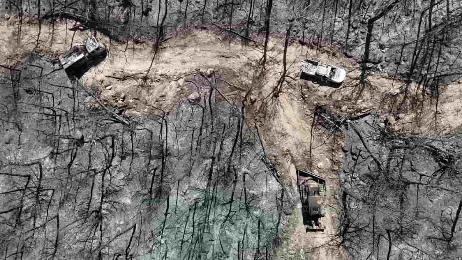 Erzurumbulten-Eskişehir’de çıkan orman yangınında 10 kişinin şehit olduğu alana yakın bir noktada yanan araçlar görüntülendi. Bazı parçaları eriyen araçlardan su tankerinin olay yerinden çekildiği ve yerde sürükleme izleri olduğu görülürken, arazöz, pikap ve dozerin ise yakın zamanda olay yerinden çekileceği öğrenildi.