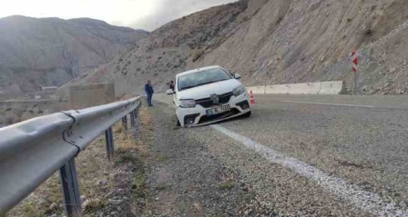 Erzurumbulten-Erzurum'un Uzundere ilçesinde yola düşen taşlar nedeniyle kontrolden çıkan araç bariyerlere çarparak dururken, otomobil göle uçmaktan son anda kurtuldu.